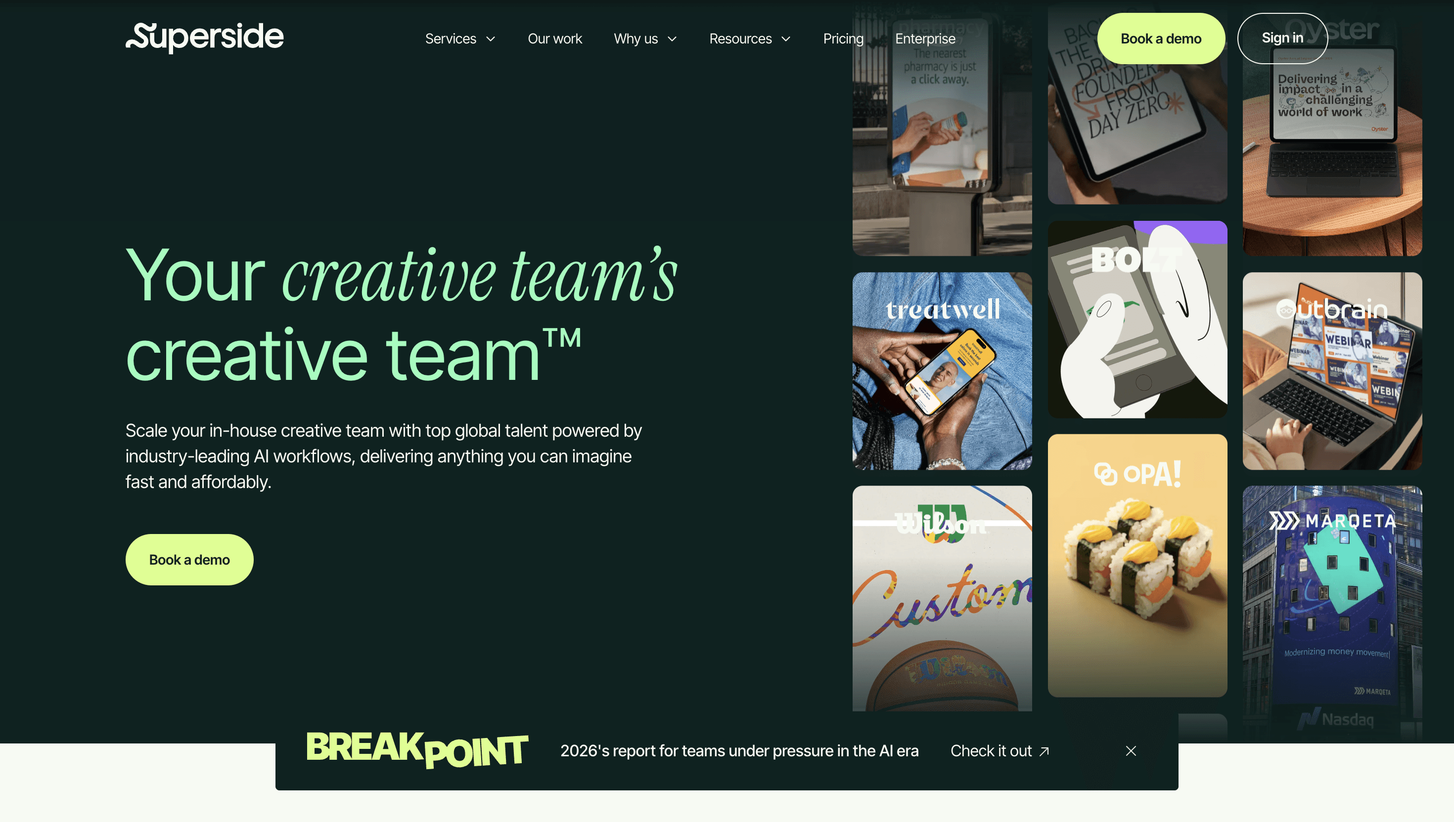 AI-assisted subscription creative service combining a 750+ global creative network with dedicated project managers and a proprietary Superspace platform that integrates with Asana and Jira.