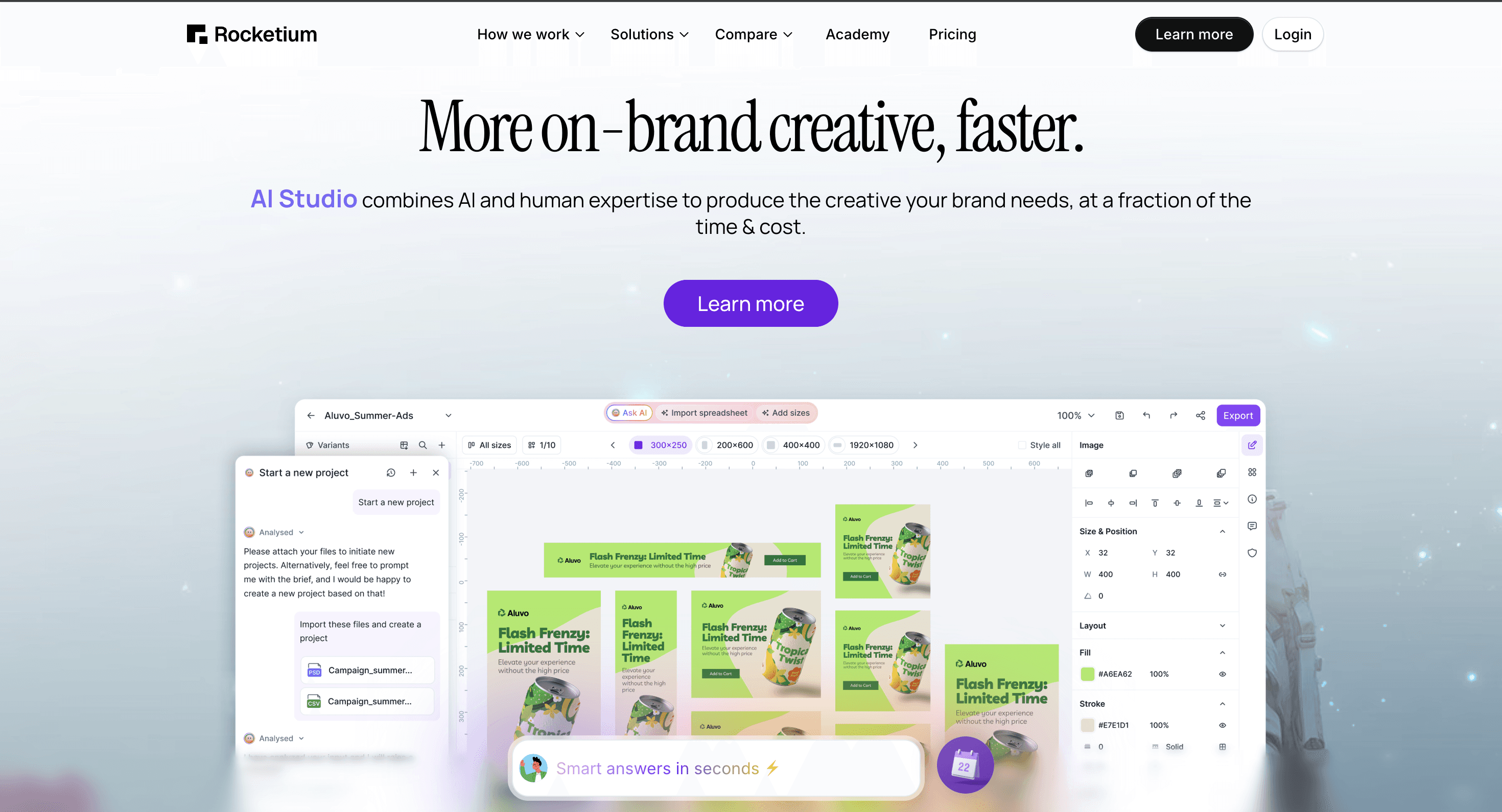 A creative automation tool gives your team software to operate. You set up templates, run production, manage approvals, and publish assets. A managed creative production service like Rocketium AI Studio handles the production pipeline for you. You submit a brief; production-ready assets come back. The managed model typically produces higher compliance rates and studio-quality output because it includes human QA and expert creative strategy. All while still leaving final control in the user’s hands to make any last minute adjustments.