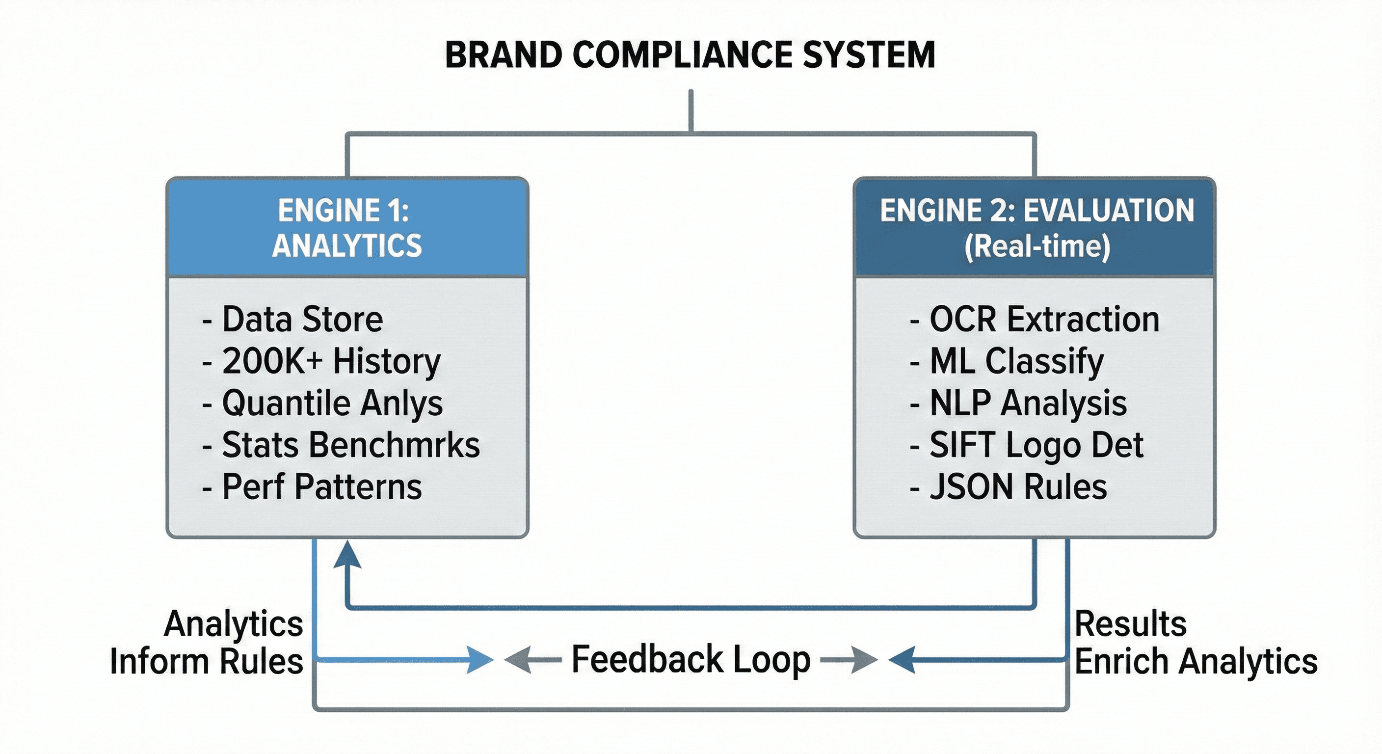 The core of the system is a dual-intelligence architecture. Two complementary engines work together. One learns from historical data to establish benchmarks, the other validates creatives in real-time using OCR, machine learning, NLP, and computer vision.