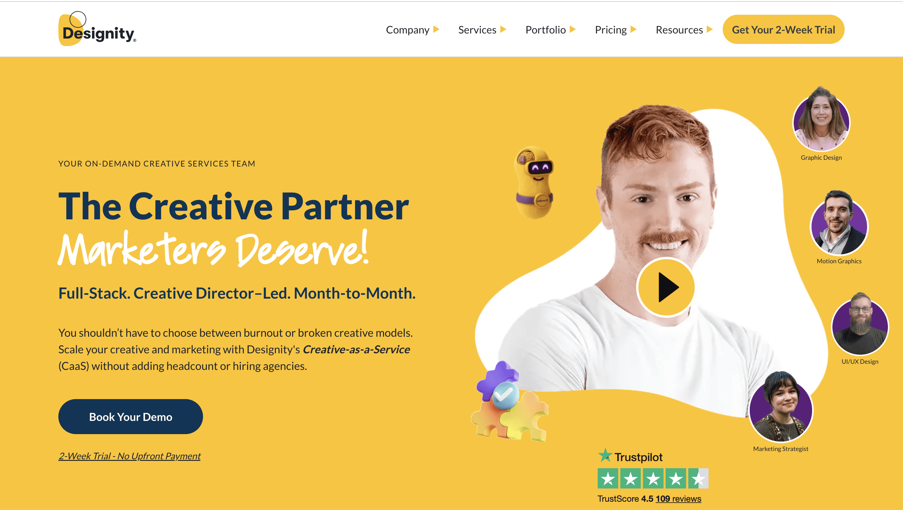 The dedicated Creative Director is the headline differentiator. While most subscription services assign project managers, Designity provides strategic creative leadership. 100+ services including strategy, web development, and content. Month-to-month flexibility. Trustpilot rating of 4.9/5, the highest among comparable services.