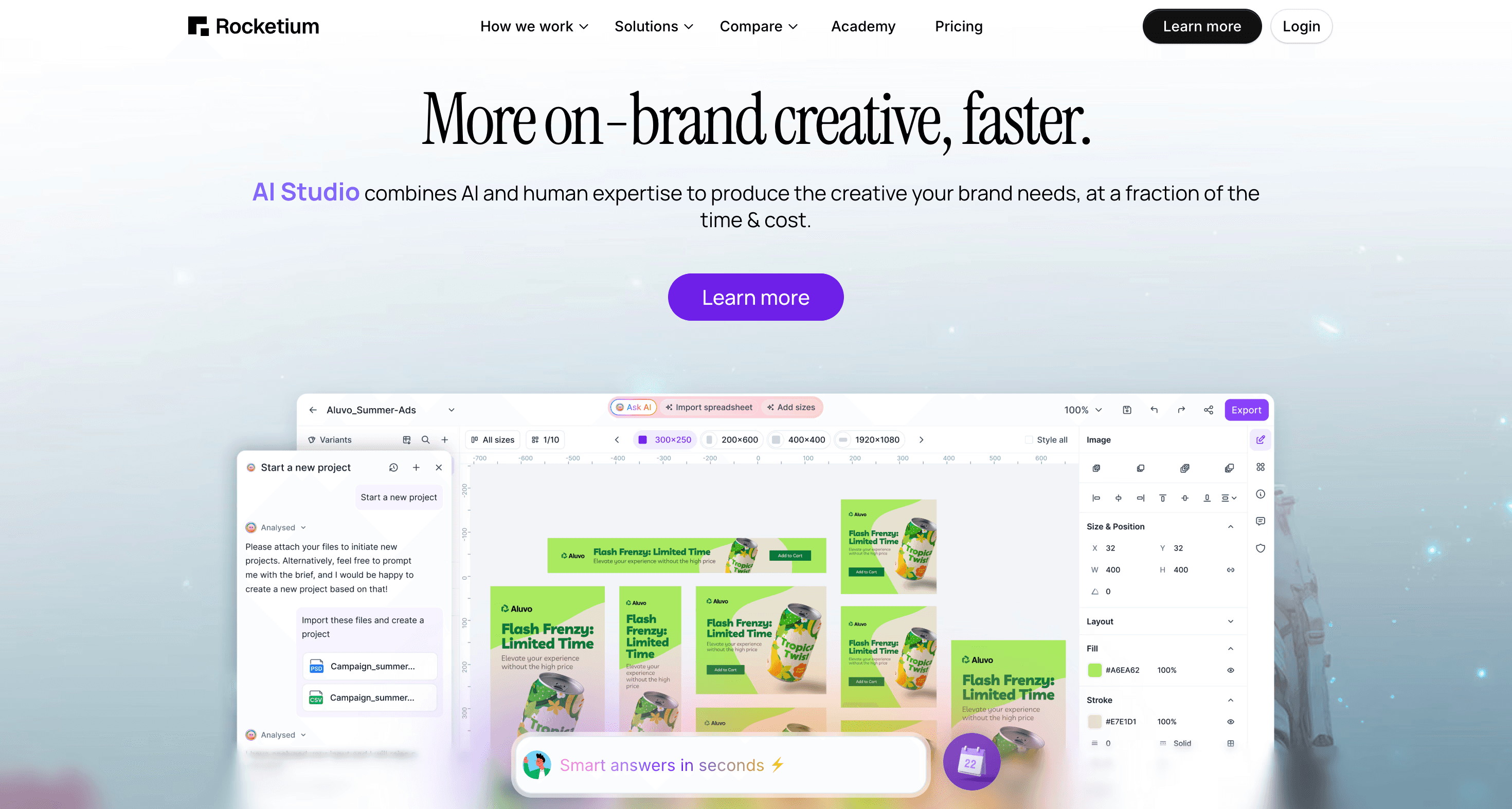Rocketium AI Studio. Twelve Amazon teams produce 250,000 assets per year through the platform, with built-in compliance for brand and retailer specs. MegaFood produced 1,100 PDP assets in under 4 weeks, saving 40% versus freelancers.