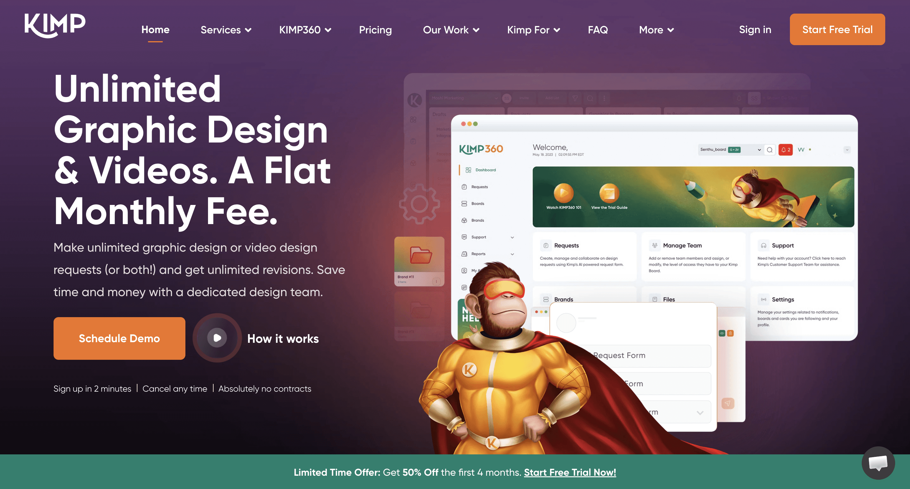 Kimp Graphics: $1,397/month. Kimp Video: $1,397/month. Graphics+Video: $2,491/month. All month-to-month with 7-day free trial. Quarterly, bi-annual, and annual options at discount.